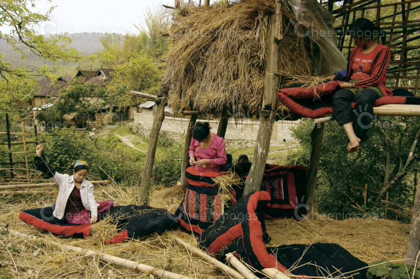 缅甸,村庄的新娘和夥伴缝制嫁妆帕垫