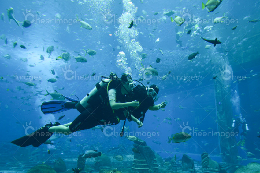 亚特兰蒂斯度假酒店,360度超大水族箱内潜水。海南三亚海棠区。
