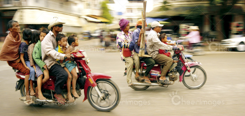 柬埔寨金邊,街頭到處是藝高膽大的摩托車乘客,不時出現多人乘坐一車的驚險鏡頭