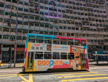 途徑怪獸大廈的電車。中國香港鰂魚涌