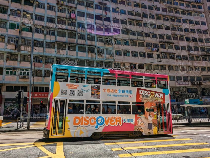 途徑怪獸大廈的電車。中國香港鰂魚涌
